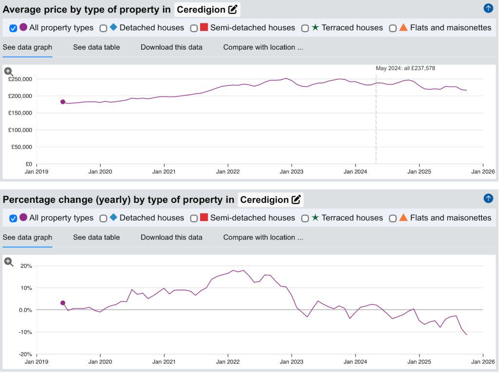 The average property price in Ceredigion fell from £217,684 in September 2025 to £215,748 in October 2025, reflecting the general nervousness in the market as rumours around the Budget circulated. All property types saw a drop in their average prices.