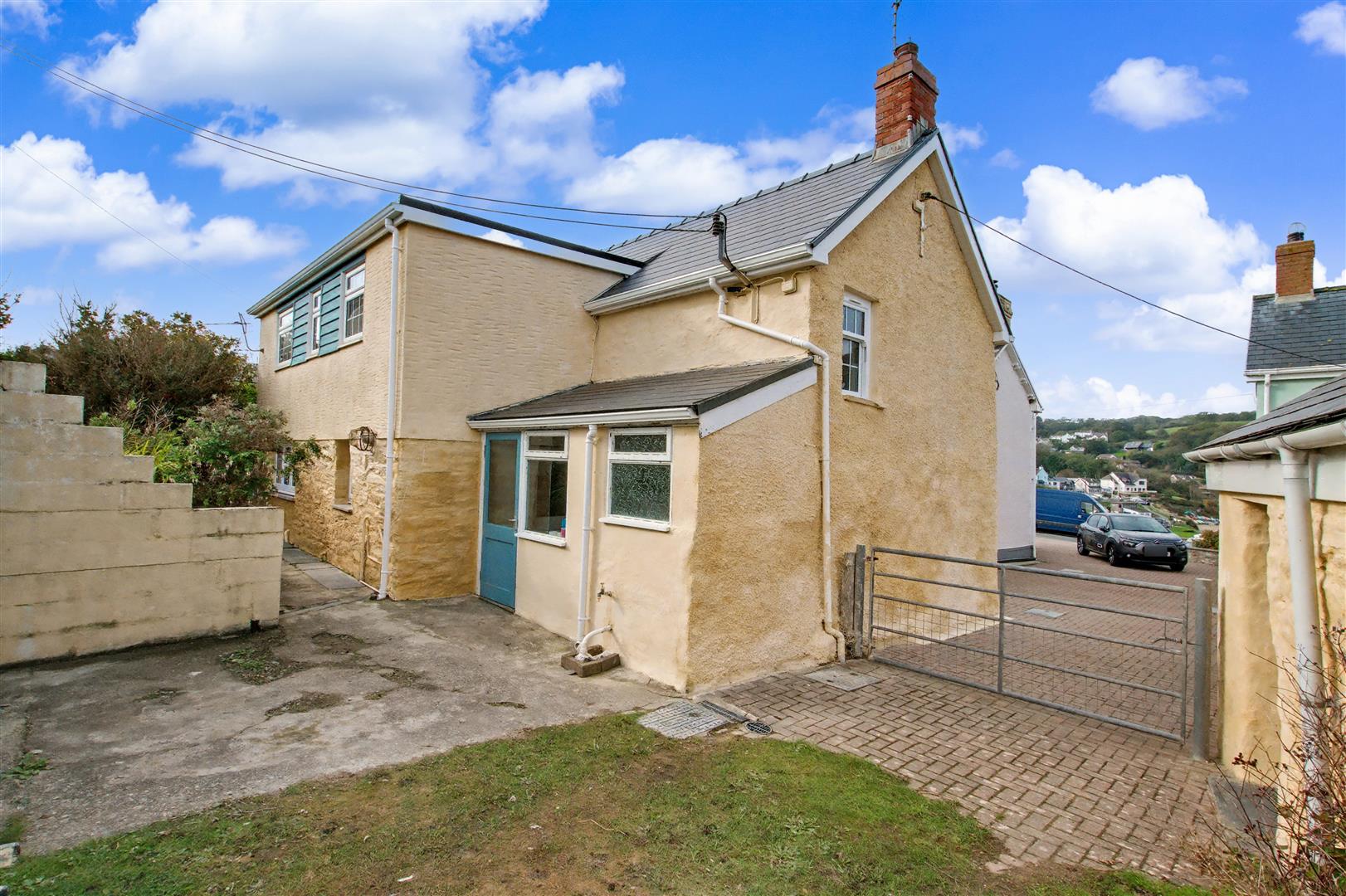 The property is accessed from a no-through road, with a shared entrance leading onto its own driveway and parking for 2–3 vehicles. The garage stands separately just outside the back door — handy for storage or even conversion, subject to consent — while the generous garden areas run behind and to the side of the house, framing those standout sea views while offering further possibilities.