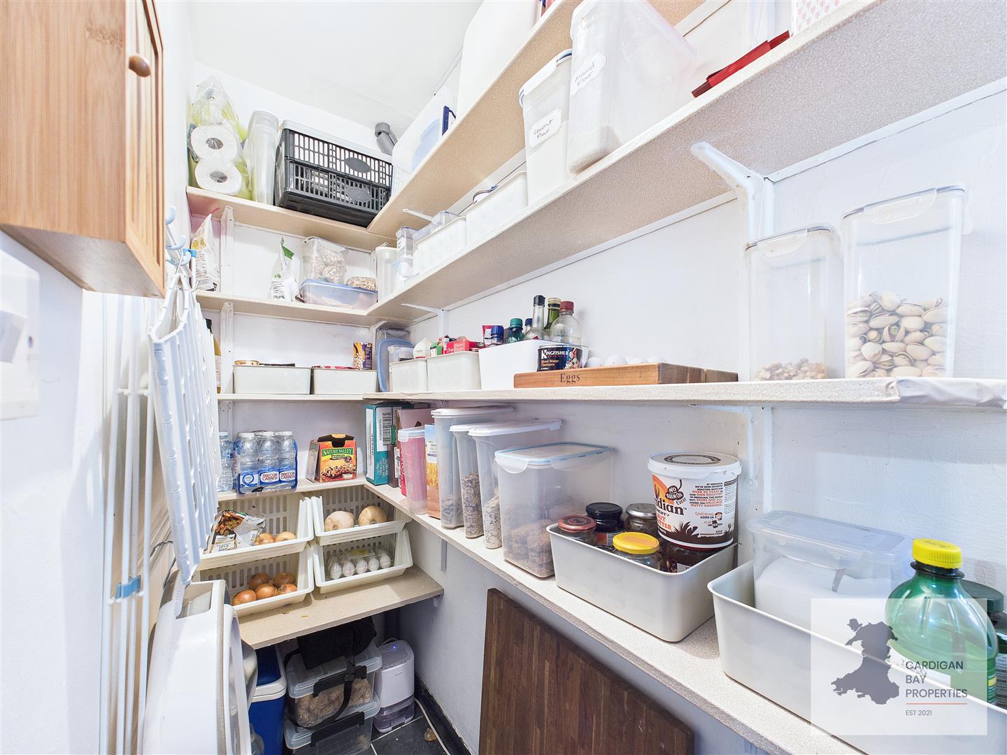 The kitchen sits towards the rear of the house and is fitted with a good range of wall and base units under worktops. It includes a four-ring induction hob with extractor above, an eye-level double oven and grill, and space for both a dishwasher and washing machine. The solid-fuel Rayburn, used for cooking, adds a traditional feature while complementing the modern fittings. A door opens to a handy pantry fitted with shelving—perfect for storing kitchen essentials—and a further door gives access to the rear garden.