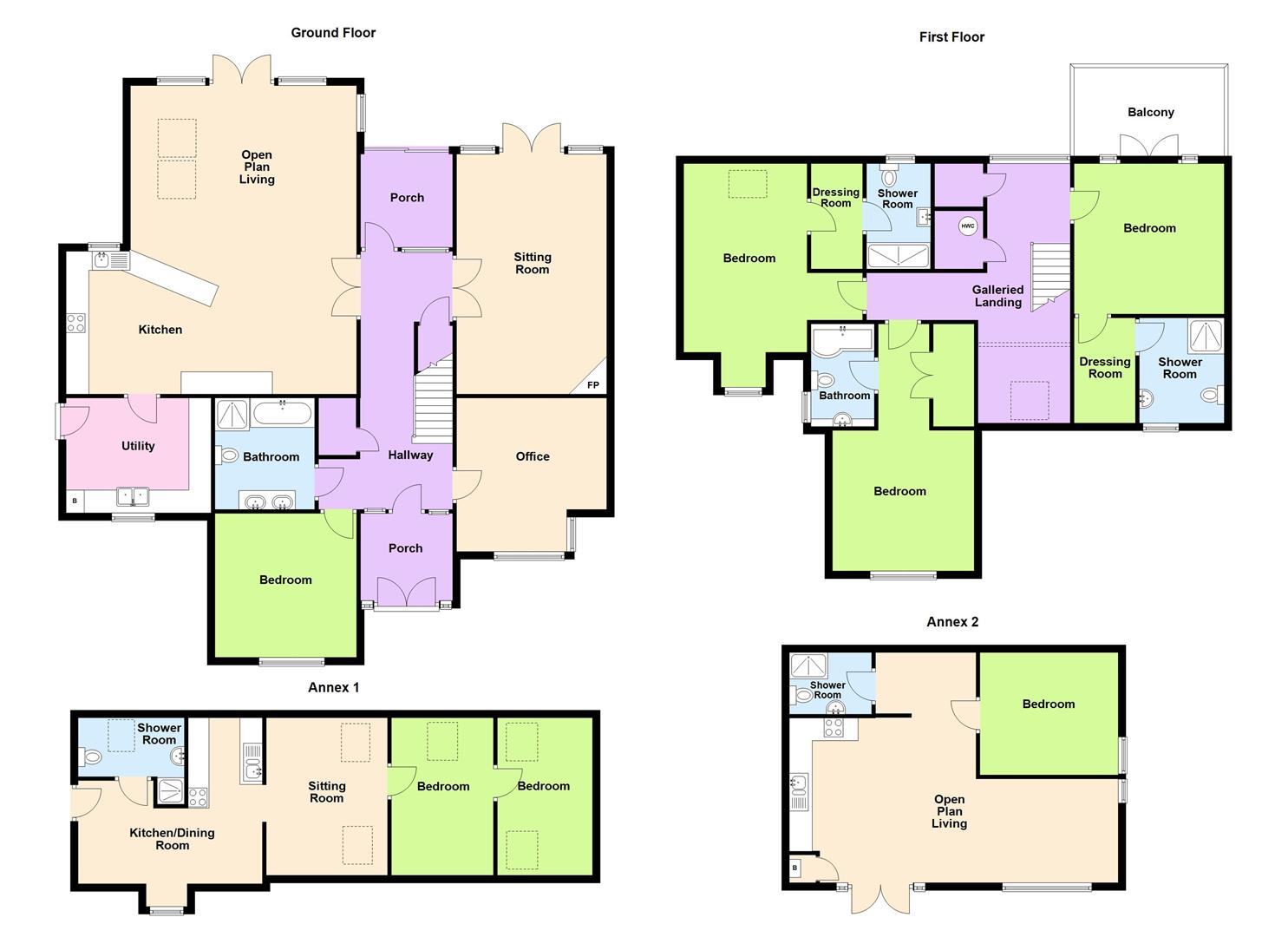 HEATING: The main house has an Oil boiler servicing the hot water and central heating with an additional immersion heater for the hot water if required. Solid Fuel Log Burner in 2nd sitting room, the Granny annexe has a separate boiler and is heated by LPG gas bottles. The Holiday apartment has electric radiators and an immersion heater
