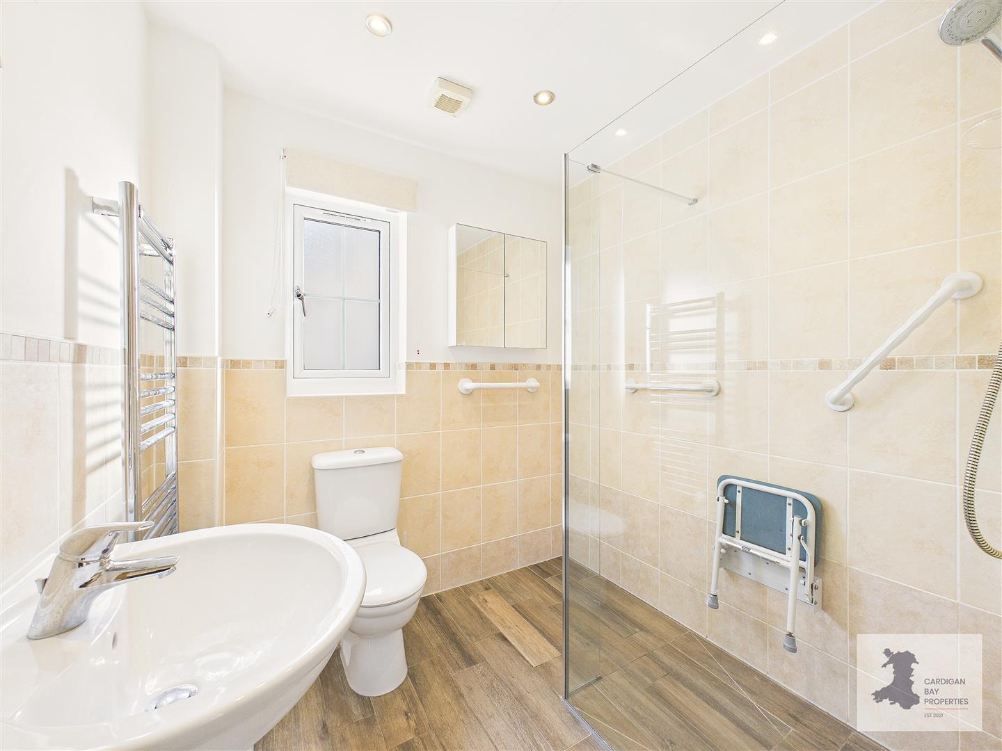 There are two bedrooms, both well proportioned for a property of this type. The front bedroom would suit use as a generous single or small double, while the rear bedroom is a good-sized double overlooking the garden. The bathroom is fitted with a toilet, wash hand basin and a level double shower, offering a practical, accessible layout.