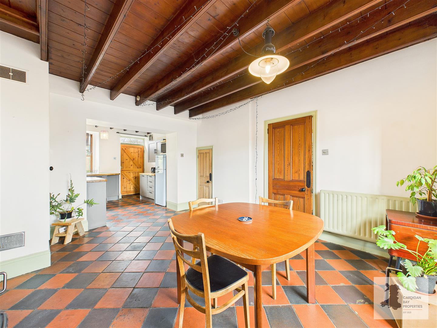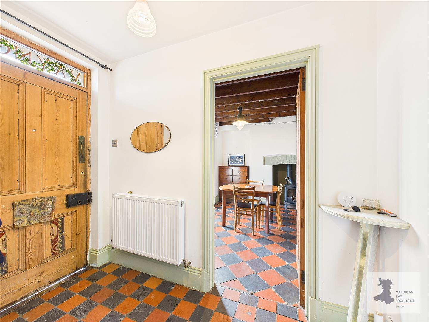 The panelled front door opens into a central hallway where the tone of the house is immediately clear. Quarry tiled flooring, original panelled doors and a staircase rising to the first floor all set the scene, giving a sense of the property’s age and character without feeling overdone.