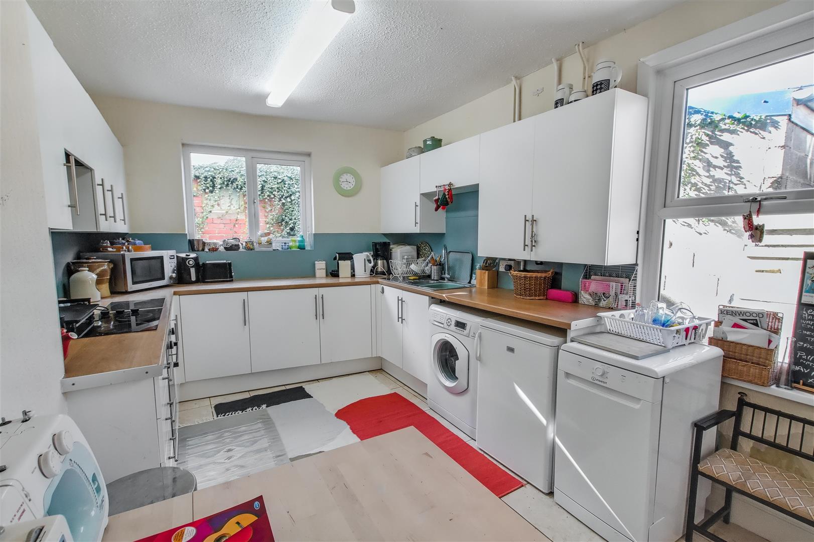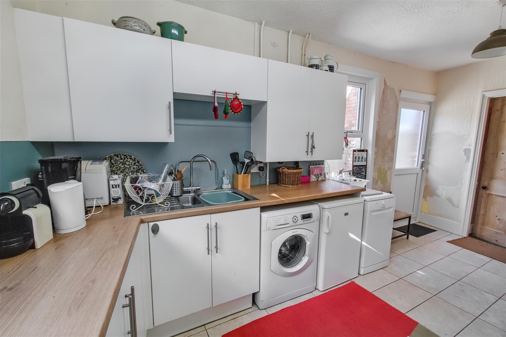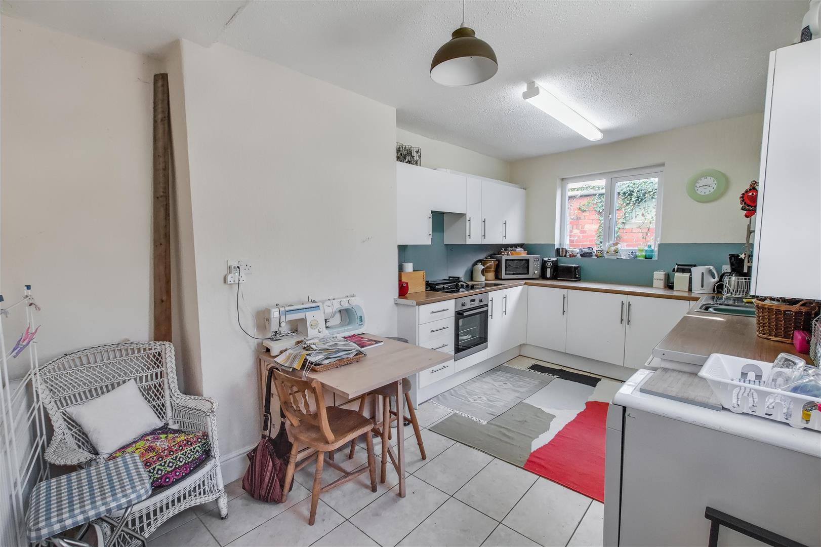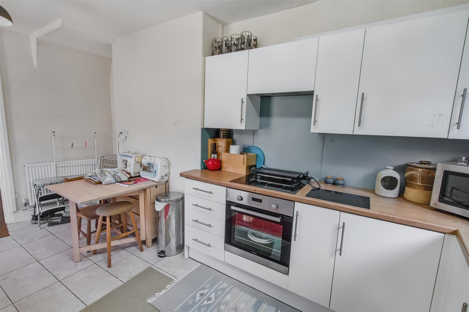 The front lounge has a bay window that allows plenty of natural light and features an ornate slate fireplace. Currently boarded, it has potential, subject to checks, to accommodate a wood burning stove or gas fire. The adjoining sitting/dining area includes a further fireplace with a gas fire in place, a window to the rear, useful under stairs storage, and direct access to the kitchen.