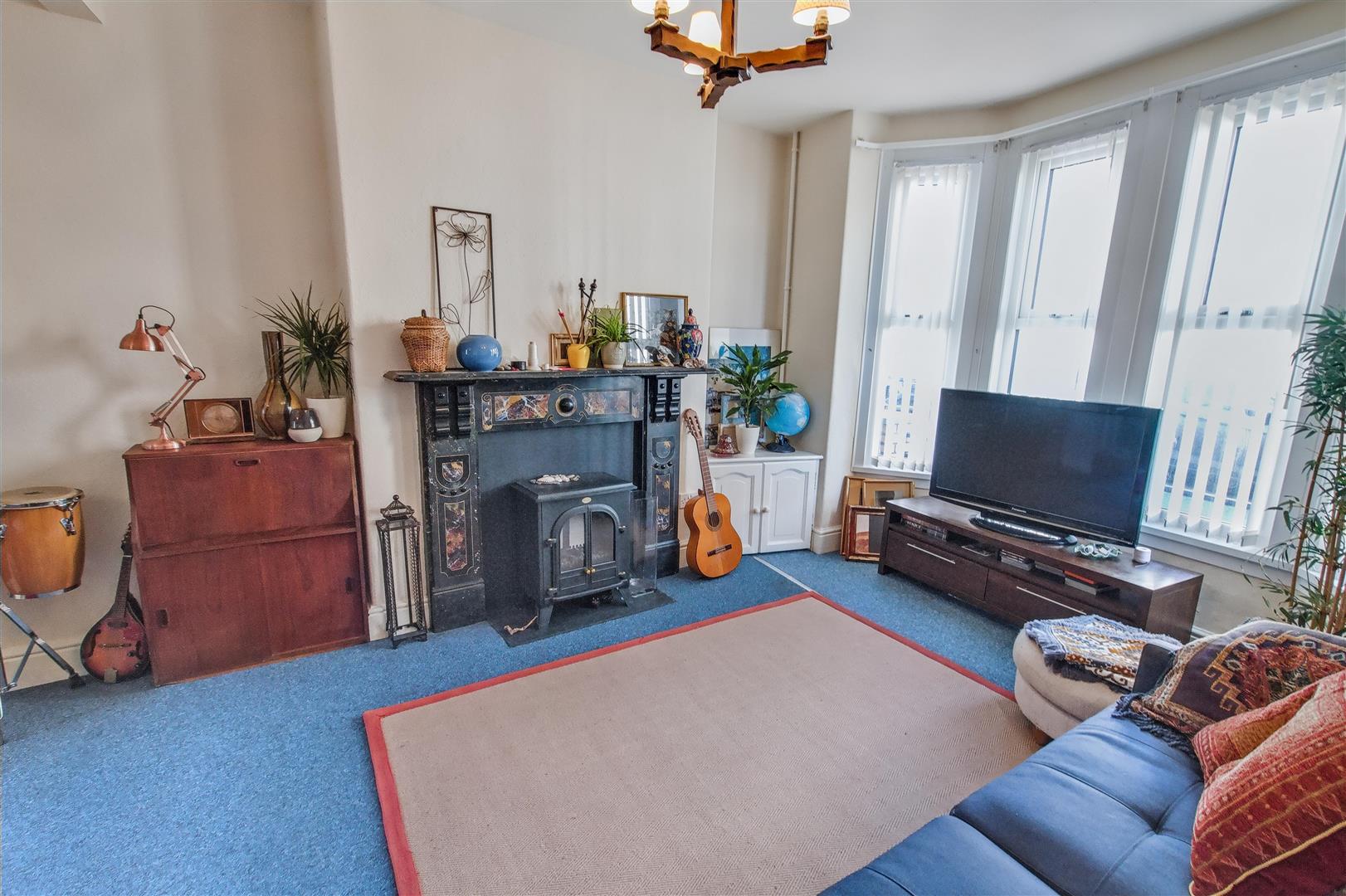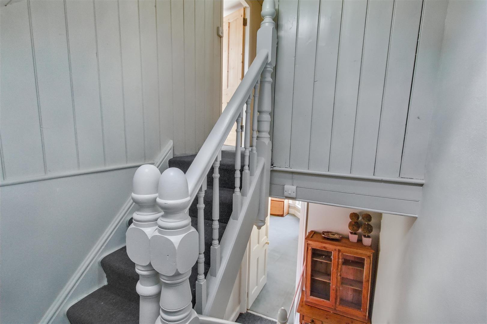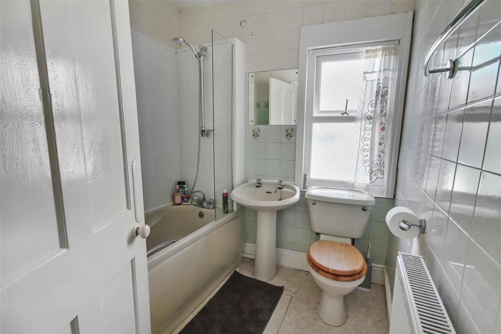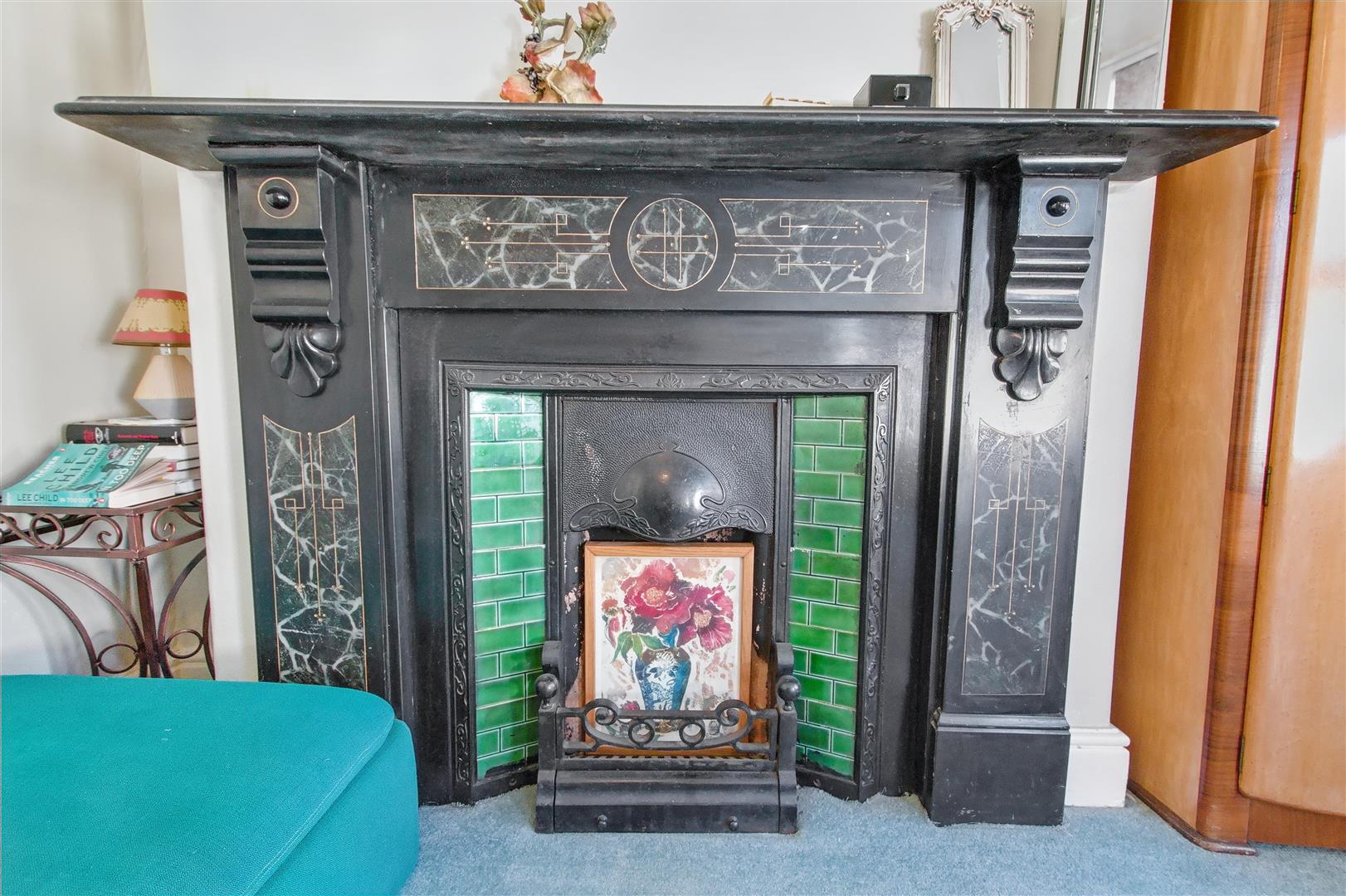 The split staircase rises to the first floor, where there are three bedrooms and a bathroom. The rear bedroom is a generous single with views across the back, while the middle bedroom is a comfortable double. To the front, the master bedroom is a light-filled, generous space with a bay window and an additional window and retains its original slate and tiled fireplace as a feature.