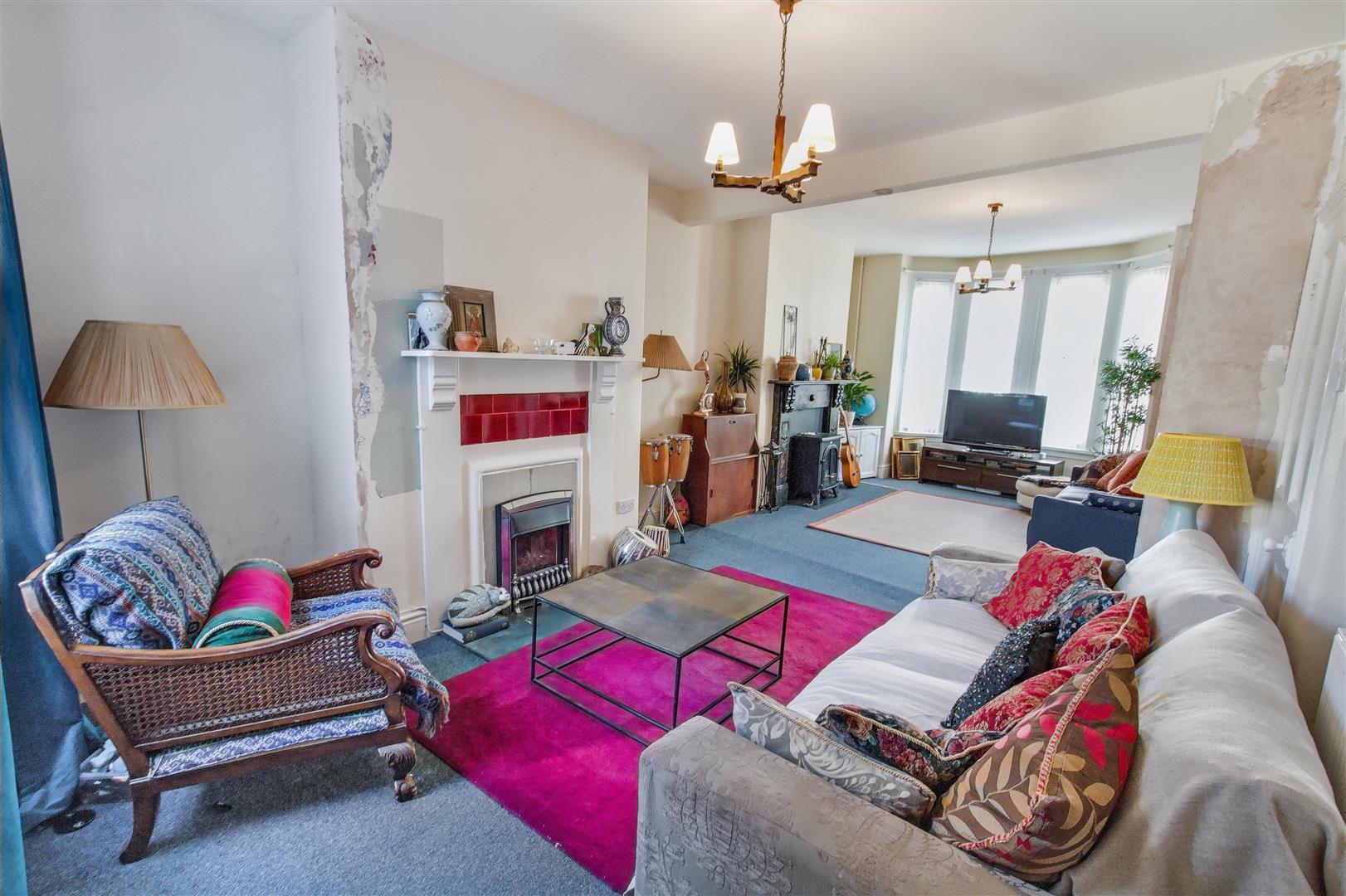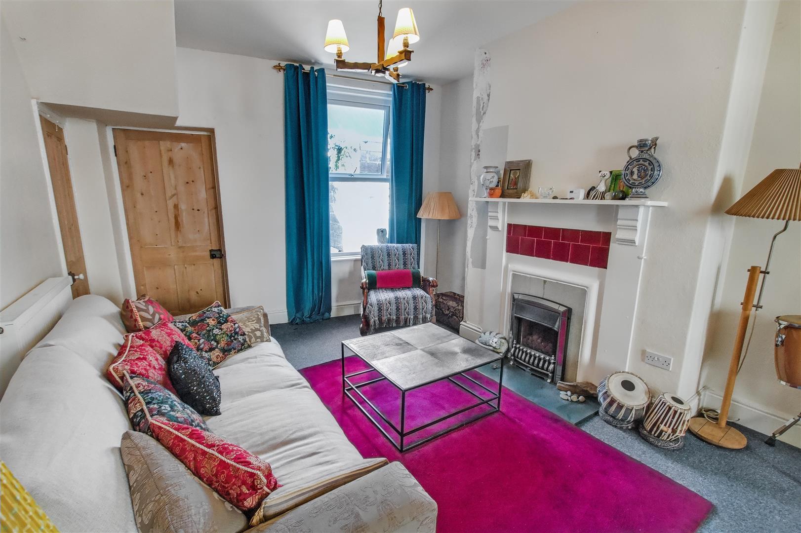 The entrance is off the pavement through brick-built pillars and two slate steps, into a front porch, where the striking original tiled floor and part-tiled walls immediately highlight the character of the home. A door opens into the hallway, with stairs rising to the first floor and access into the open plan lounge and sitting/dining space.