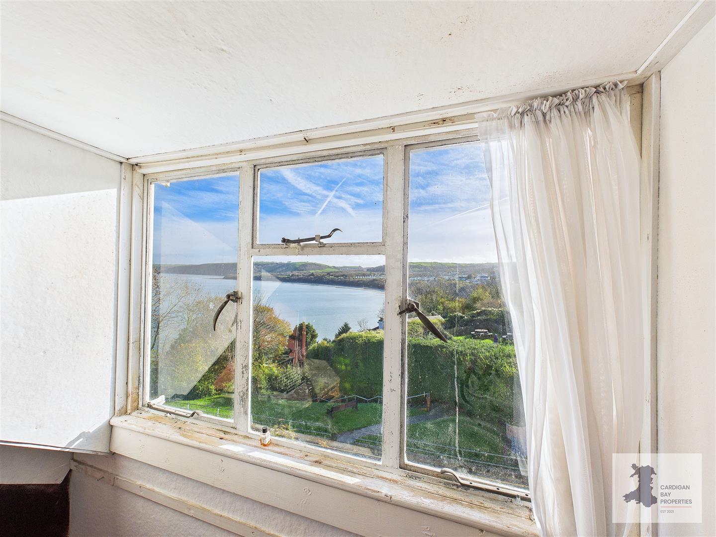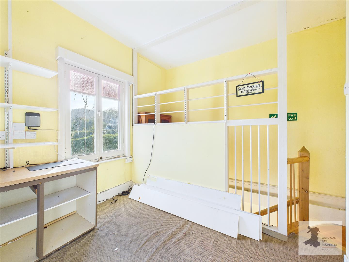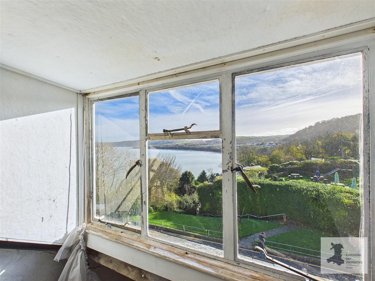A doorway on the landing leads to another set of stairs rising towards the attic level, while also linking through to the extension section on the first floor. The extension area contains a w/c with a sink, along with a door that leads to the side of the property—though this exit is currently unusable due to the partial removal of metal steps. Beyond this point sits a further reception room, historically used as an office. Built-in desk space and storage make practical use of the room’s shape, and once again the sea can be seen from here. Stairs within this room lead down to the reception space below, forming an internal connection between the two levels of the extension.