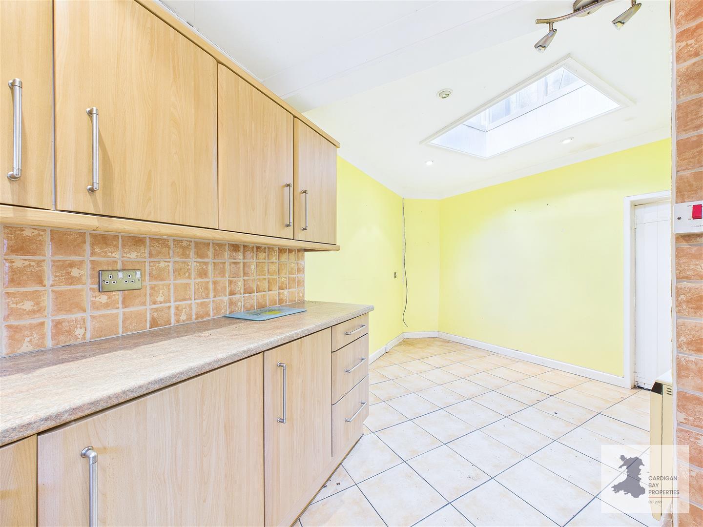 The rear hall leads through to the kitchen and dining area, creating a gradual shift from the more traditional parts of the home into a slightly more modern layout. The kitchen holds a range oven with a gas hob and extractor fan, along with a selection of base and wall units offering storage without dominating the room. A one-and-a-half sink and drainer sits beneath a window that looks towards the rear garden, keeping the space bright without relying on strong artificial lighting. The dining area links naturally with the kitchen and is topped by a lantern-style ceiling window, drawing daylight down from above in a calm, unobtrusive way.