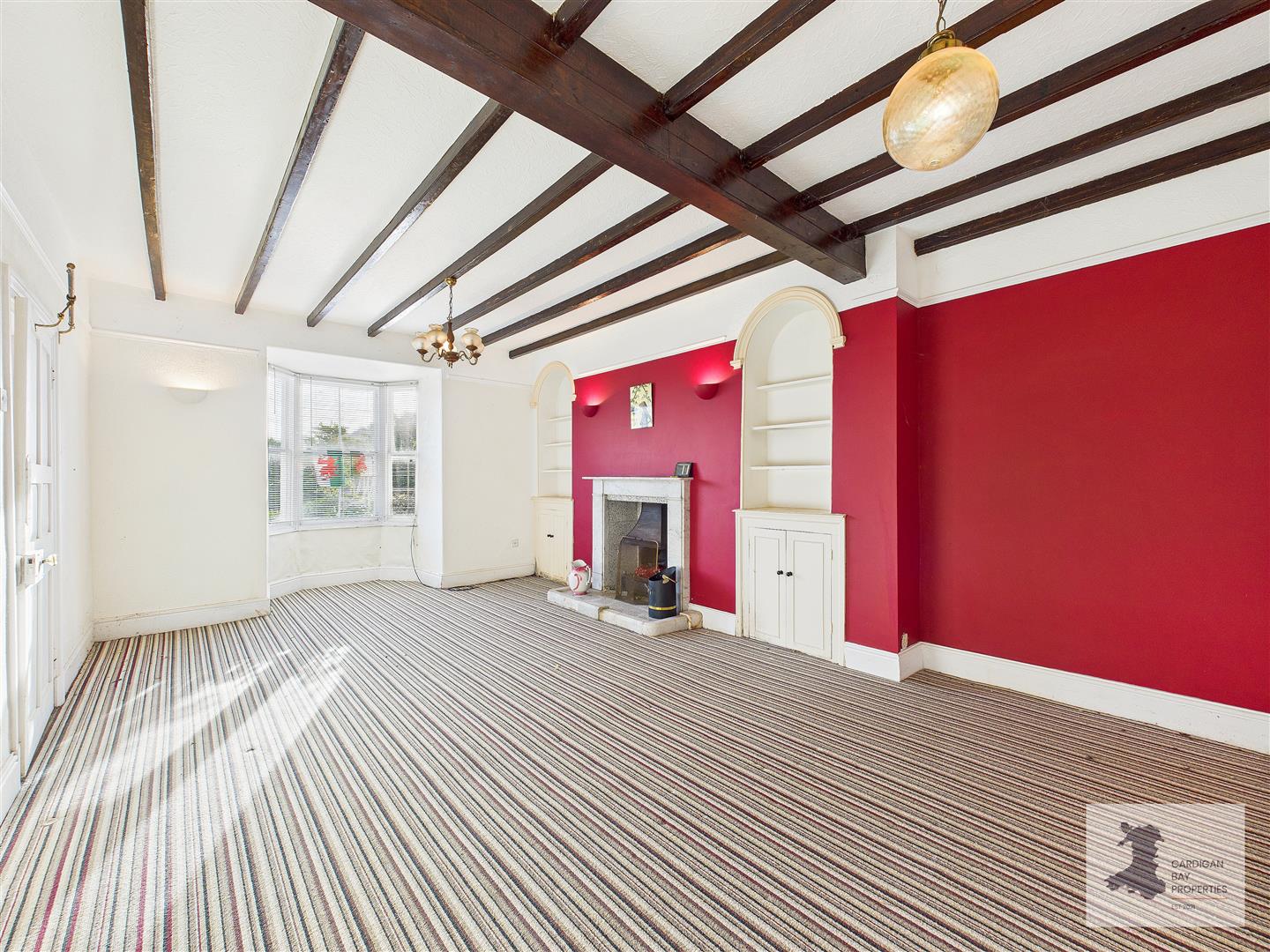 The lounge sits to one side of the hallway, marked by a bay window that faces directly towards the sea. The outlook here gives a steady reminder of the location, with the front garden in the foreground and the shoreline stretching beyond. Built-in shelving and storage units run along one wall, blending into the space without overpowering it. Exposed beams add age and texture overhead, while a marble mantelpiece holds an open fire that has clearly been a long-standing part of the room. A plate rack and picture rail complete the setting, adding small but distinctive details that reflect the home’s period roots.