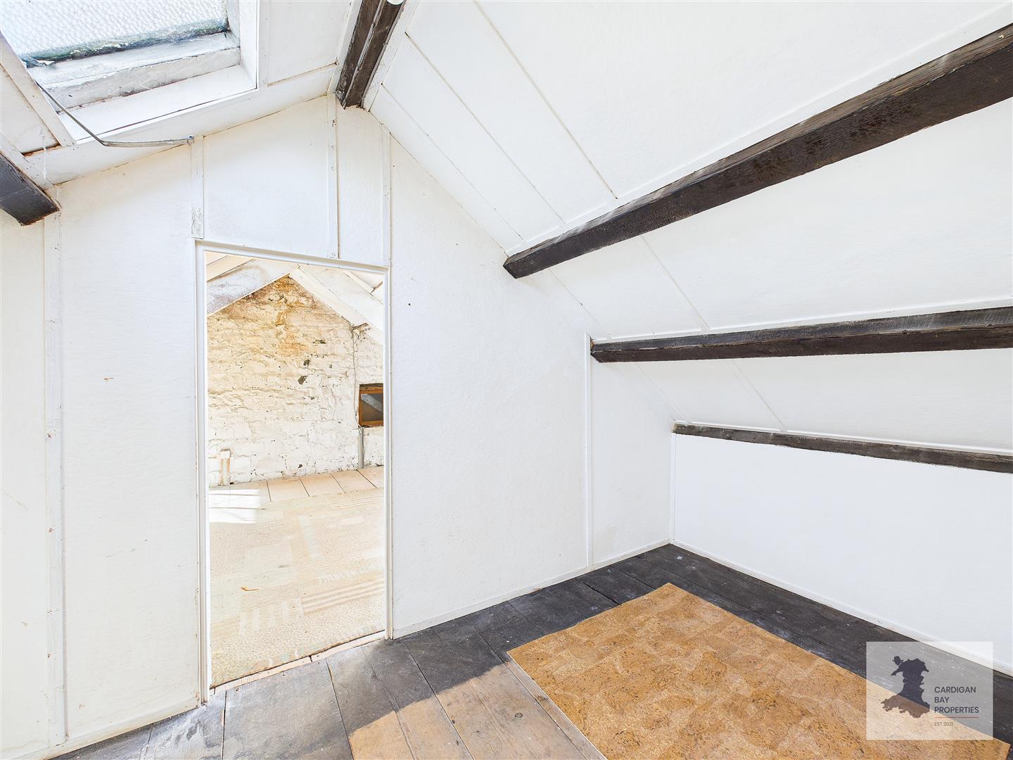 Climbing to the second floor, the stairs rise beneath an area of restricted headspace, something typical of older attic conversions. The top landing carries a skylight that brings in natural light and helps define this upper portion of the house. Two further rooms branch off from here. Each has exposed and painted stonework, exposed floorboards, and a dormer window offering clear sea and coastal views. These spaces could be shaped into bedrooms or alternative rooms if future owners decide to seek the necessary building regulations. They hold a mix of character and potential, with the outlook across the water forming a continual highlight.