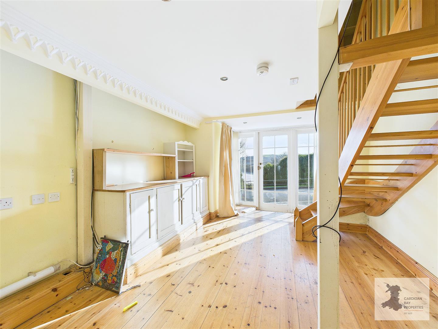 From here, steps lead down to the extended reception area. This lower room has double doors with full glazing, making the most of the sea outlook even from the rear part of the house. Storage cupboards sit neatly against one wall, and the room feels well-shaped for a range of uses—whether kept as a relaxed seating area, a hobby space, or something more practical. The way it sits slightly lower also gives it a different character to the rest of the ground floor, adding another layer to the property’s overall layout.
