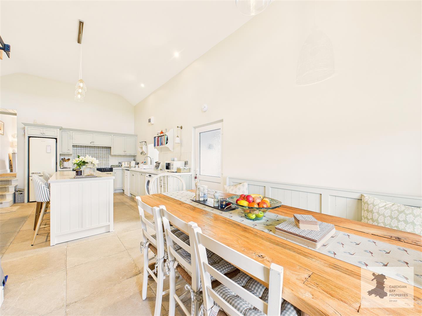 - Vaulted kitchen/diner with porcelain tiled flooring and central island