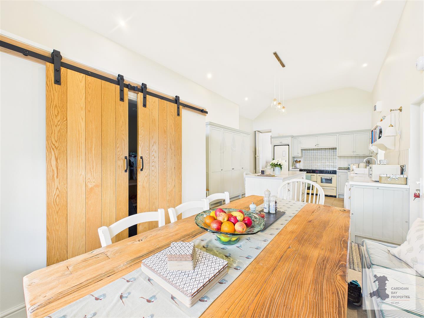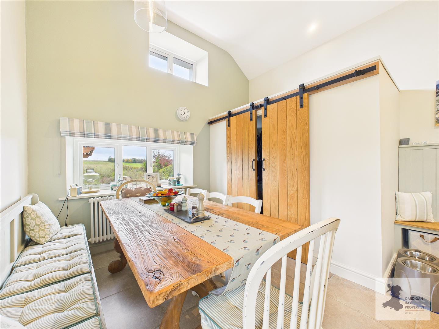 The heart of the home is the vaulted kitchen and dining area. This is a bright, sociable space with porcelain tiled flooring and a practical layout that combines charm with functionality. A range of wall and base units, including a useful pantry cupboard, provide ample storage, while the range-style electric cooker forms a natural focal point. There’s space for a fridge/freezer and a built-in dishwasher to keep everything neat and tidy.