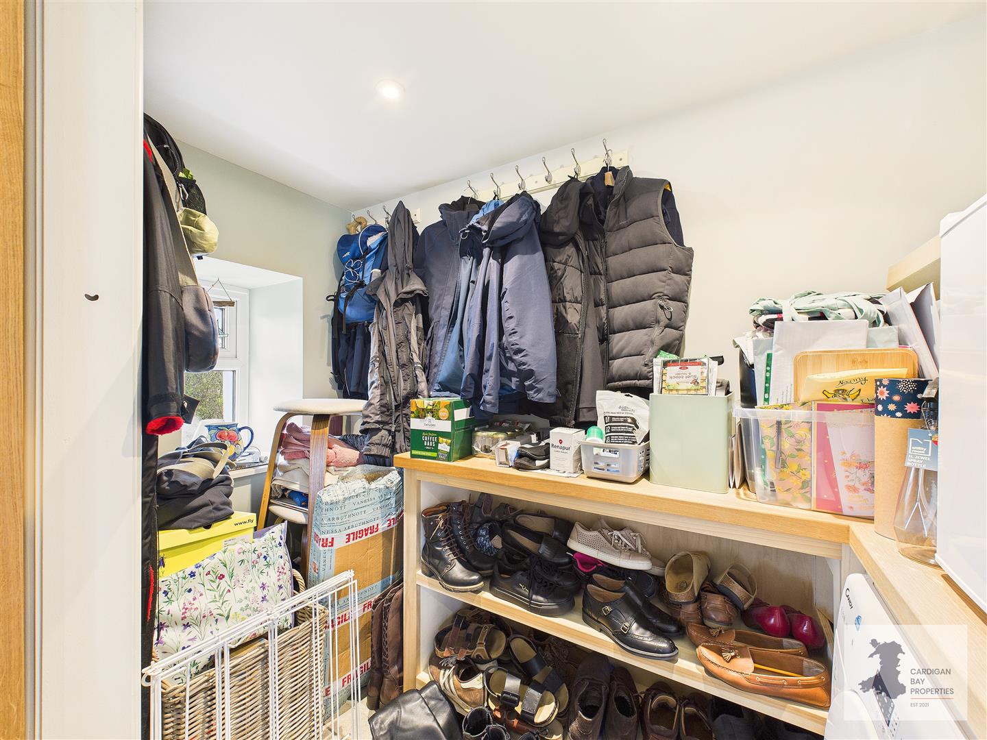 At the centre of the room, a large island adds both extra worktop space and a breakfast bar, ideal for everyday use or for relaxed gatherings with friends and family. There’s still plenty of room for a dining table, making this a space that works well for both cooking and conversation. From here, sliding doors open to a walk-in storage and utility area, fitted with shelving, a base unit, and space for a tumble dryer – keeping household tasks tucked out of sight but within easy reach.
