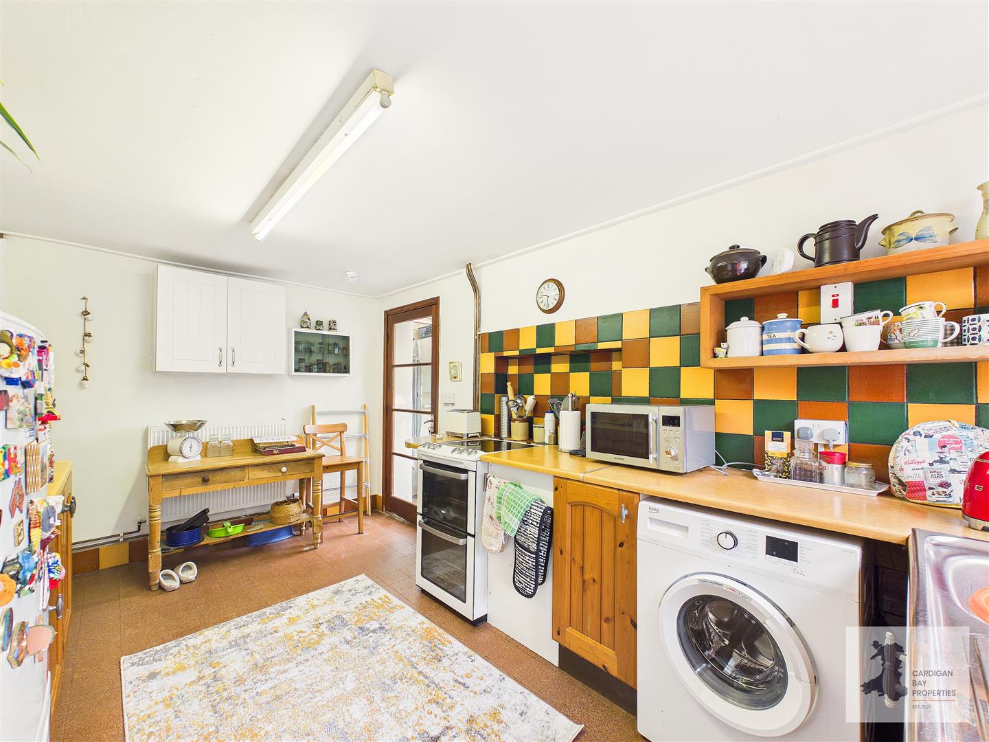 The kitchen sits to the far side of the property and offers a practical working area with a range of fitted units, work surfaces and space for appliances. A colourful tiled splashback adds character, and there is a door providing direct access outside. From the kitchen, there is also a useful utility porch area that offers additional storage and practical space for everyday household tasks.