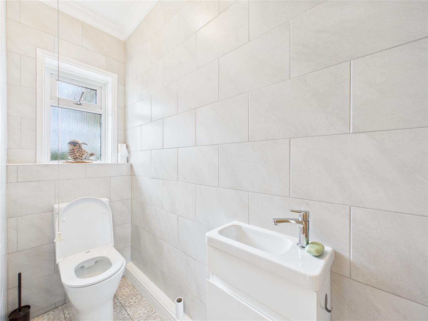 Back in the main hallway, the family bathroom has been modernised and includes a bath and sink, complemented by tiled walls. There’s also a separate w/c with its own sink, also modernised, which adds convenience for a busy household.