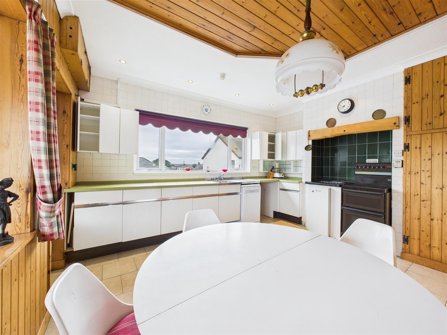 The kitchen has part wood-panelled walls and a feature section of wood panelling on the ceiling, giving it a traditional touch. From here, there are lovely far-reaching views across the surrounding landscape – a real bonus that adds a sense of openness to the room.