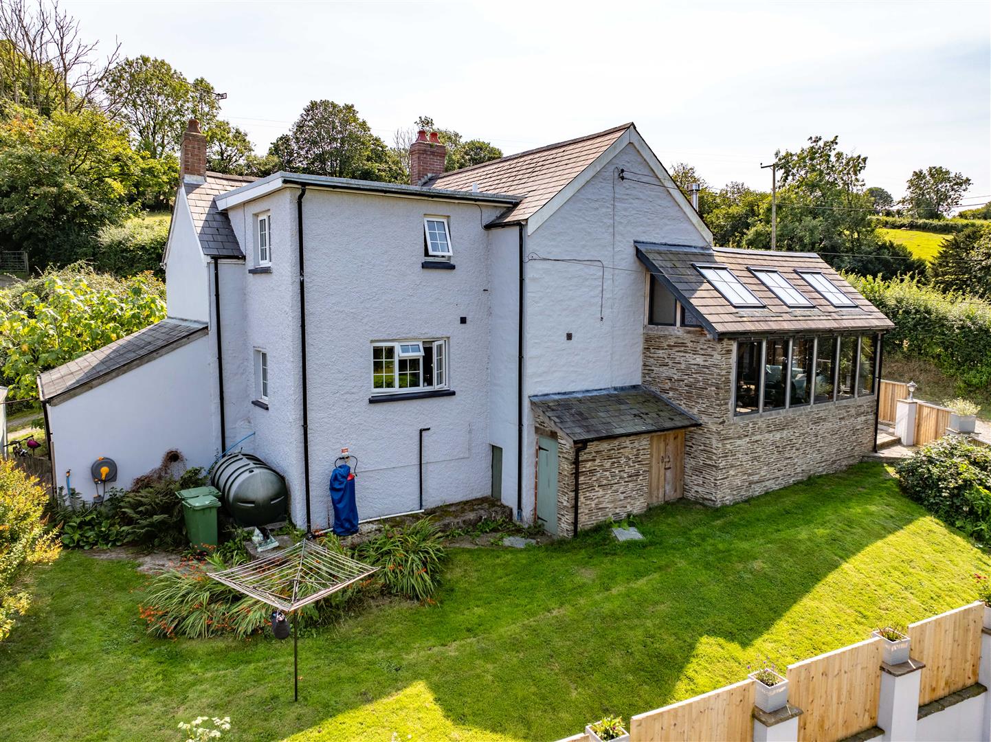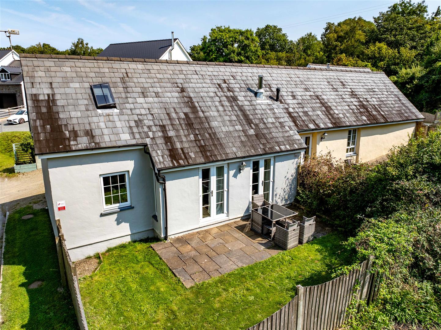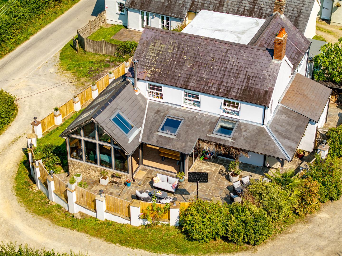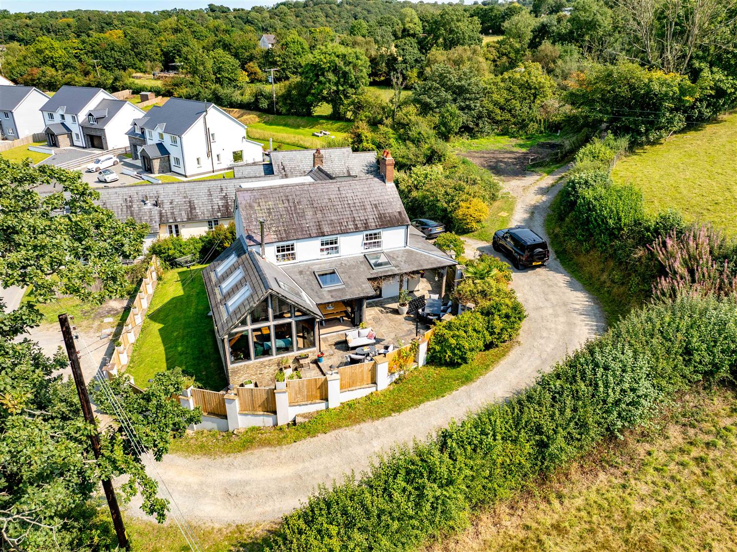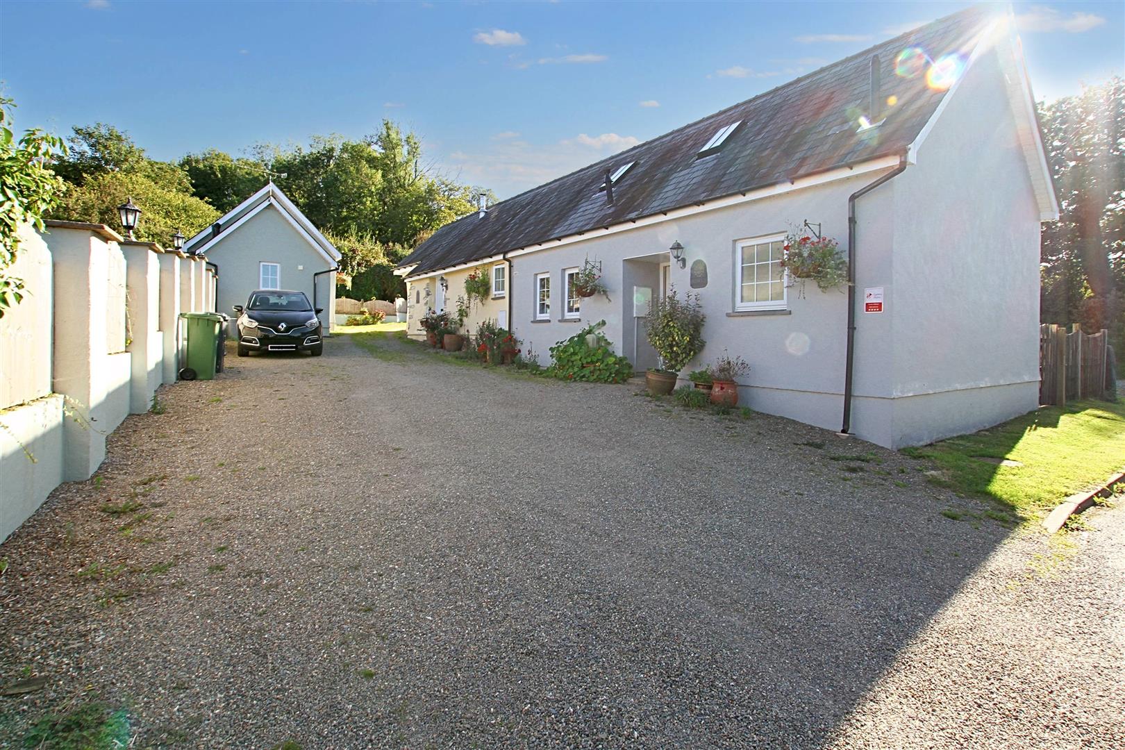 The property benefits from wide gravelled access linking the cottages and the farmhouse, forming an "in-and-out" driveway that works easily for family living and guest arrivals. A path from the drive leads to the utility room, laundry room and patio area. The patio is a sheltered, stone-paved space with a built-in BBQ and rotisserie, working well for outdoor dining and easy access to the conservatory.