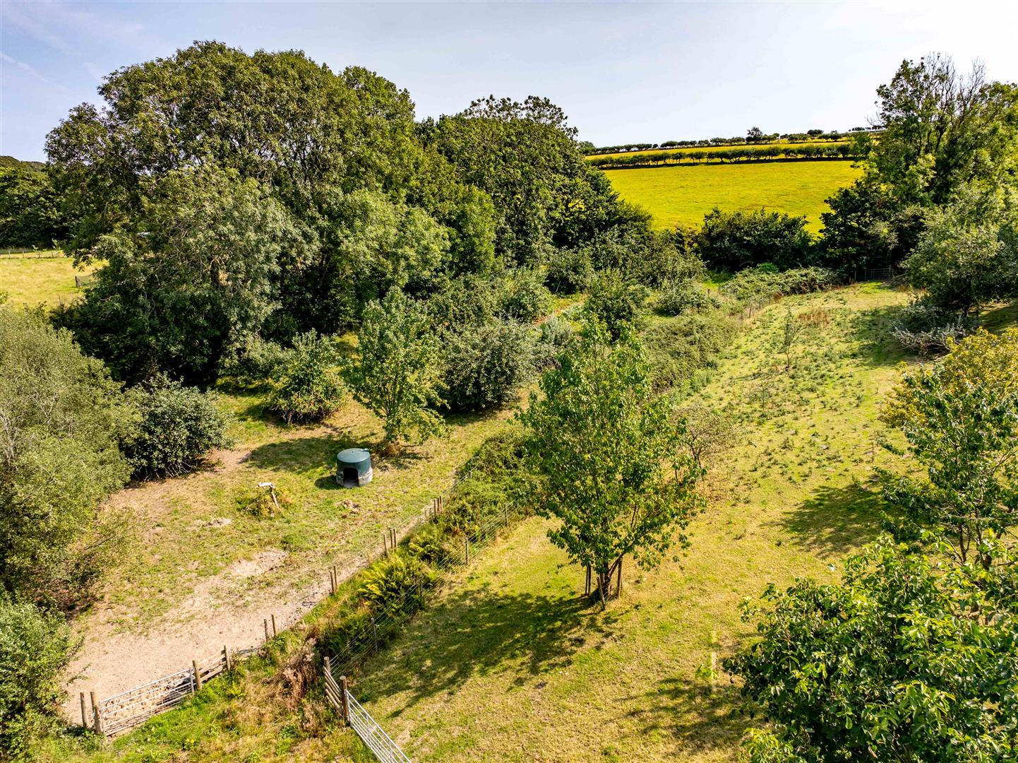 Beyond this point, the land opens into grassland and established orchards, containing Welsh cider apple varieties alongside pear and plum trees. The layout of the orchards creates pockets of interest, and the old track rising to the top fields offers a pleasant walk with open views across the surrounding countryside. From the highest point of the land, there are distant glimpses towards the sea in Cardigan Bay, reminding of the property's strong coastal position.