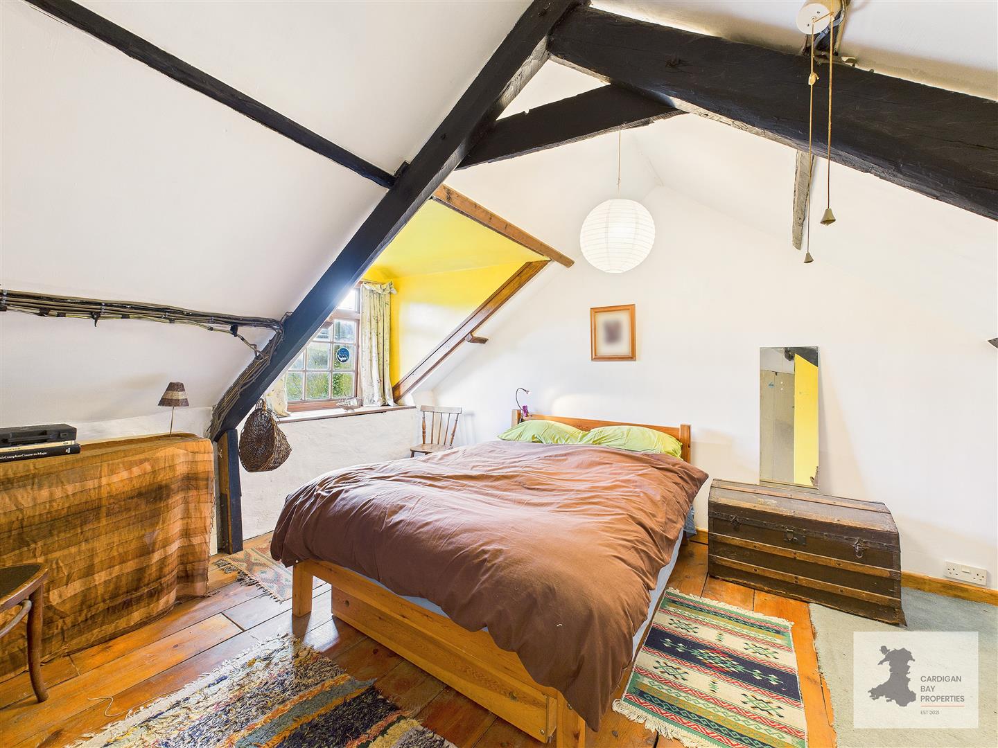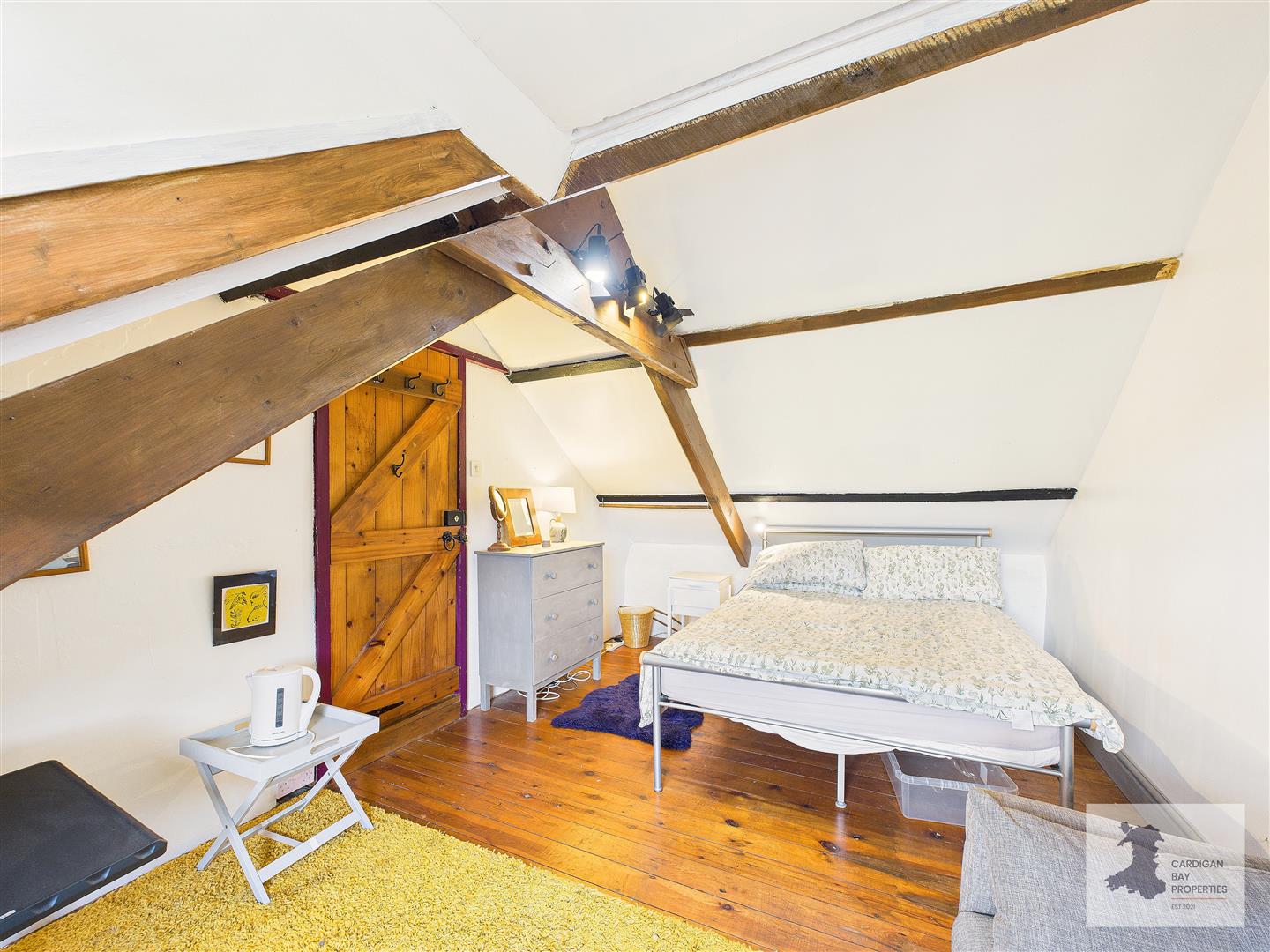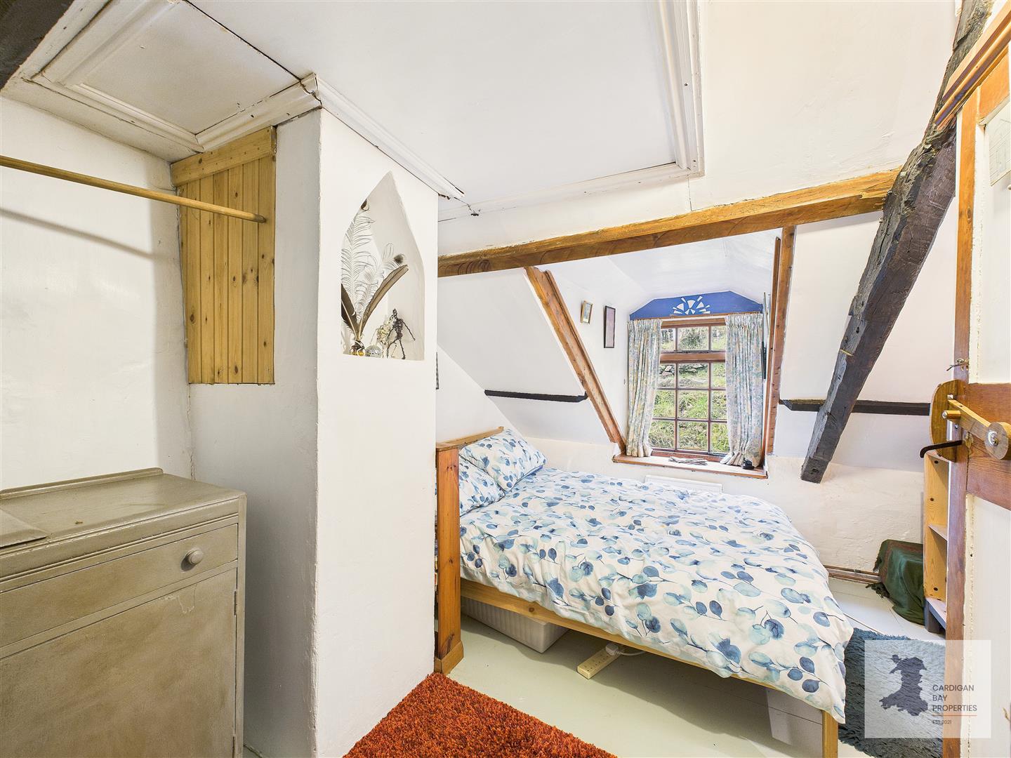 One of the cottage’s bedrooms is accessed via a wooden staircase from the living room. This double room features sloping ceilings, exposed beams, pine floorboards and a front-facing dormer window with views towards the River Cerdyn and surrounding countryside.