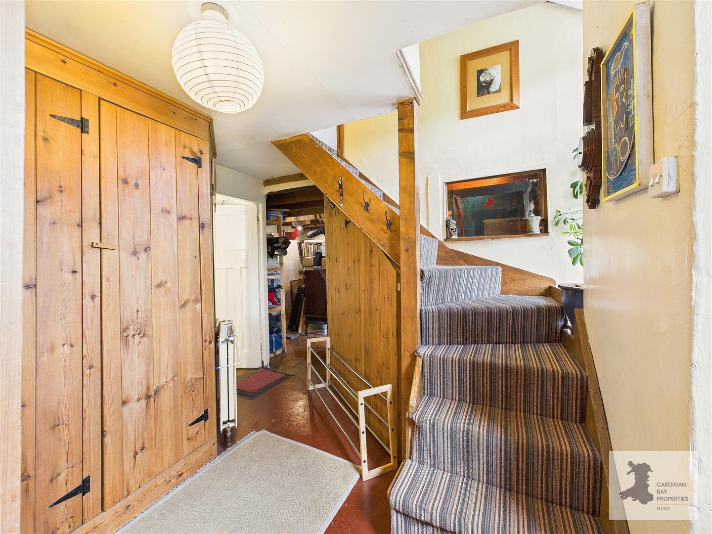 A stable door opens into a spacious entrance hall, a practical and well-used area with floor-to-ceiling pine cupboards providing excellent storage. A secondary staircase rises from the hall, with built-in storage beneath and a tall “Crittall” style window drawing in natural light and views across the valley.